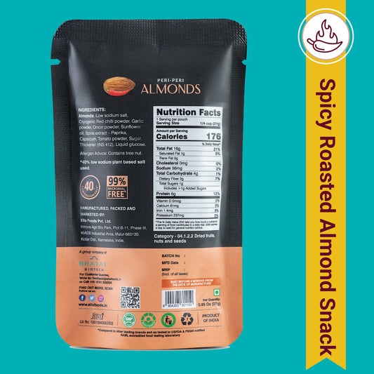 Ella Foods Peri Peri Almonds Mini Pack (5 x 27g) | Spicy Roasted Almond Snack | 40% Low Sodium | Healthy Travel Snack | 6-Month Shelf Life | No Preservatives