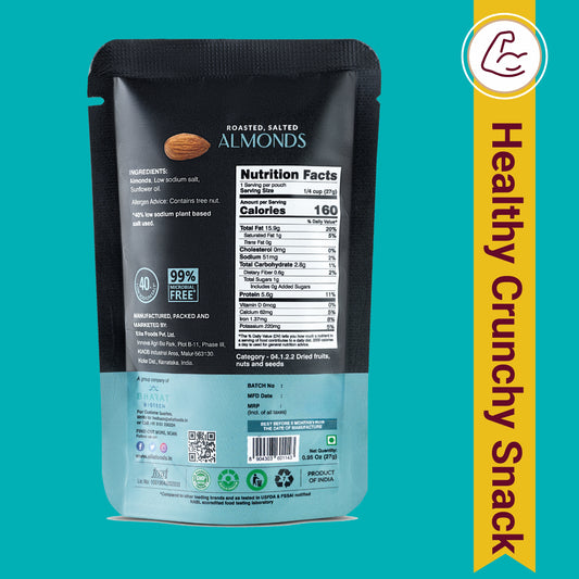 Ella Foods Salted Almonds 100g | Roasted & Crunchy | 40% Low Sodium Salt | Healthy Snack | 6-Month Shelf Life | No Preservatives