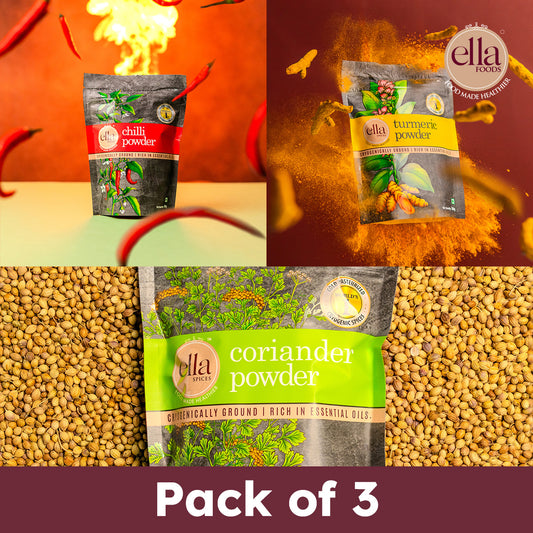 Ella Foods Spices Combo | Pack of 3 (100g Each) | Chilli, Turmeric & Coriander Powder | Cryogenically Ground | No Additives | 100% Pure & Aromatic