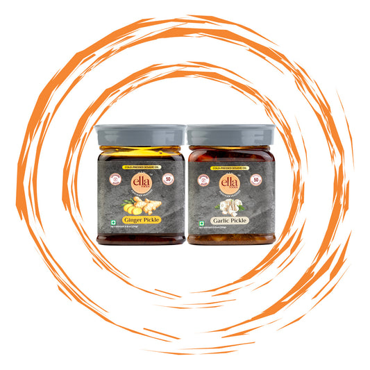 Ella Foods Ginger & Garlic Pickle Combo | Pack of 2 (250g Each) | Low Sodium | Cold-Pressed Sesame Oil | 12-Month Shelf Life | Traditional Indian Pickles
