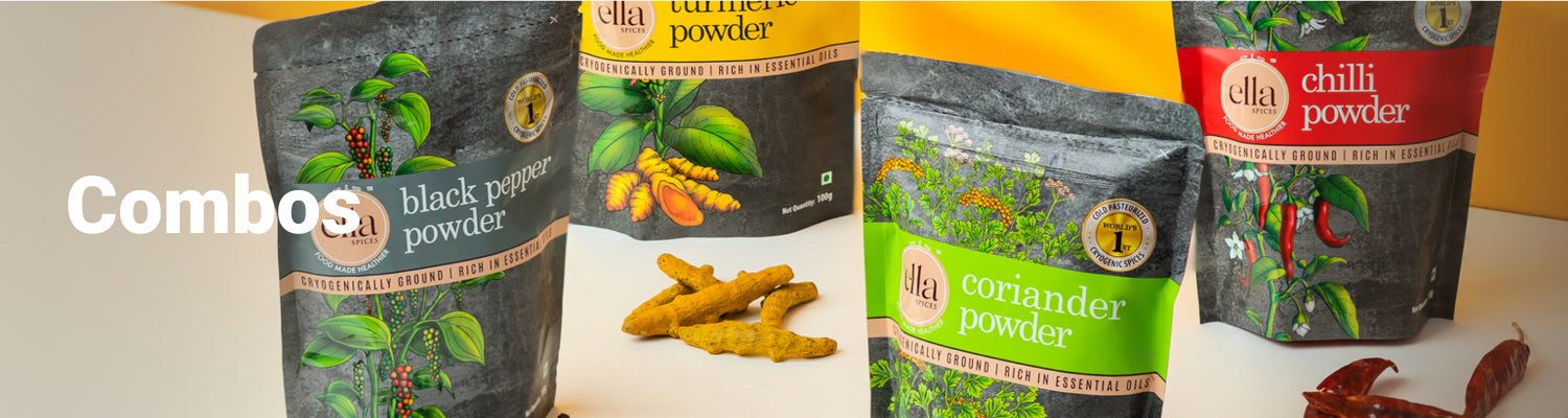 Ella Foods Spices Combo | Pack of 4 (100g Each) | Black Pepper, Chilli, Turmeric & Coriander Powder | Cryogenically Ground | 100% Pure | 2X Aroma | 18-Month Shelf Life