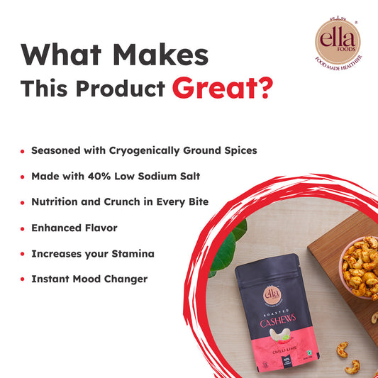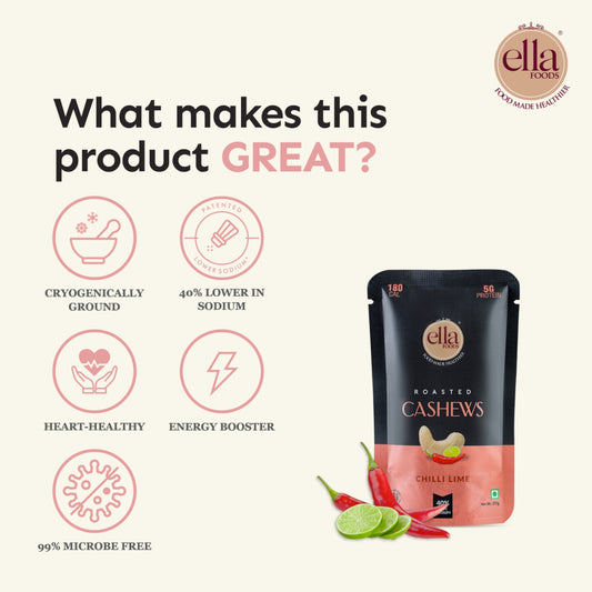 Ella Foods Chilli Lime Cashews | Pack of 2 (100g Each) | 40% Low Sodium | Roasted Cashew Snack | Spicy & Tangy Flavour | 6-Month Shelf Life | No Preservatives