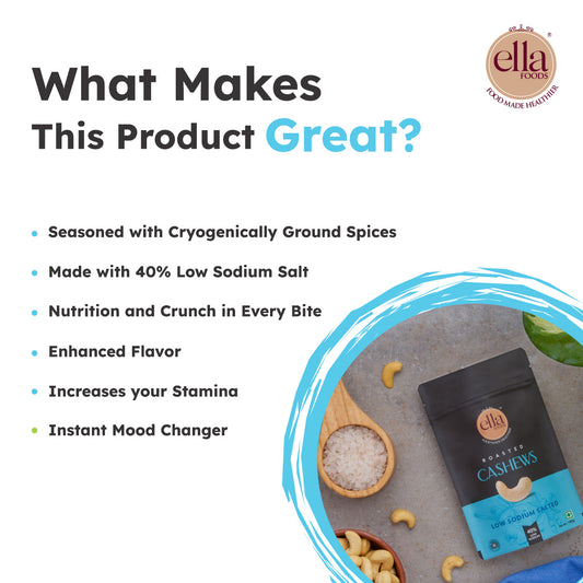 Ella Foods Salted Cashews | Pack of 2 (100g Each) | 40% Low Sodium | Roasted Cashew Snack | 6-Month Shelf Life | No Preservatives