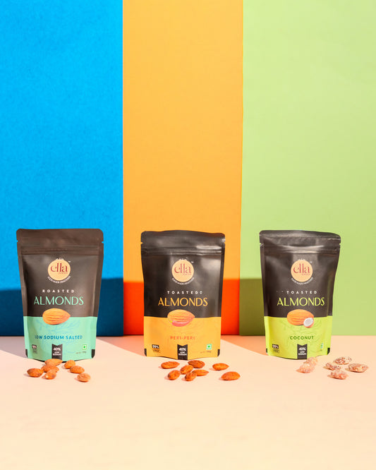 Ella Foods Assorted Nut Pack | Pack of 3 (100g Each) | Peri Peri Almonds, Coconut Toasted Almonds & Chilli Lime Cashews | 40% Low Sodium | Roasted & Flavoured Nuts | 6-Month Shelf Life