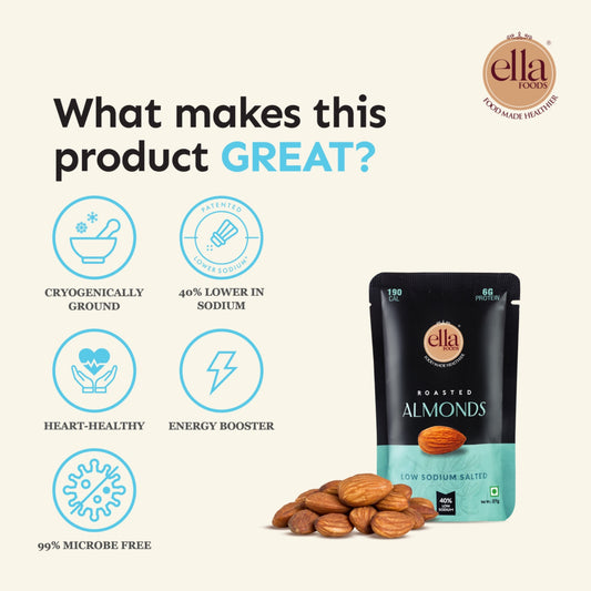 Ella Foods Salted Almonds | Mini Pack of 5 (27g Each) | 40% Low Sodium | Roasted Almond Snack | 6-Month Shelf Life | Healthy On-the-Go Snack