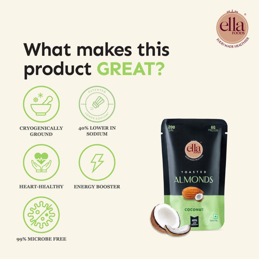 Ella Foods Coconut Toasted Almonds | Pack of 2 (100g Each) | 40% Low Sodium | Roasted Nut Snack | Naturally Sweet | 6-Month Shelf Life | No Preservatives