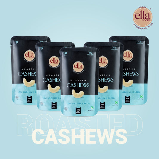 Ella Foods Salted Cashews | Mini Pack of 5 (27g Each) | 40% Low Sodium | Roasted Cashew Snack | 6-Month Shelf Life | Healthy Travel Snack