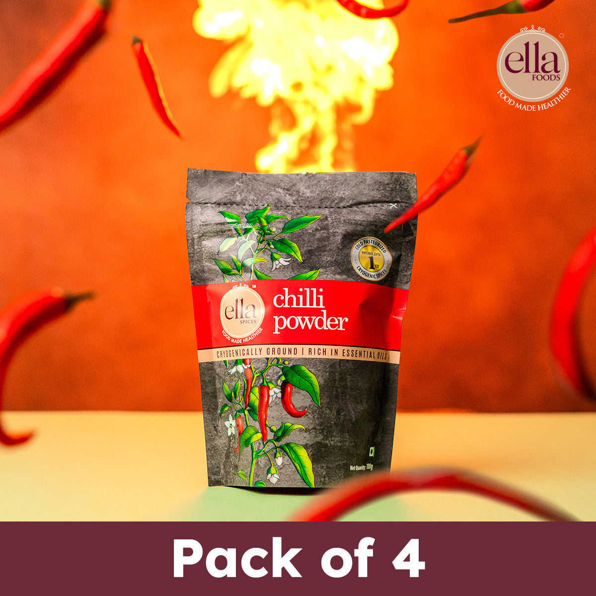 Ella Foods Chilli Powder | Pack of 4 (100g Each) | 100% Pure & Natural | Cryogenically Ground for Freshness | 18-Month Shelf Life | No Additives or Preservatives
