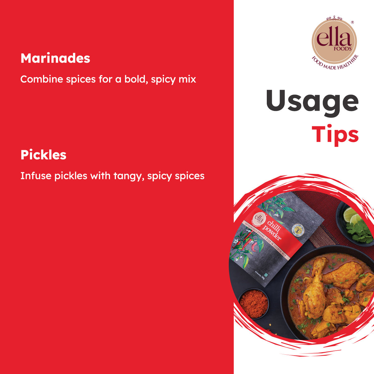 Add bold colour and vibrant heat to your dishes with Ella Foods Chilli Powder β made from premium sun-dried red chillies and cryogenically ground to retain freshness, aroma, and natural oils.