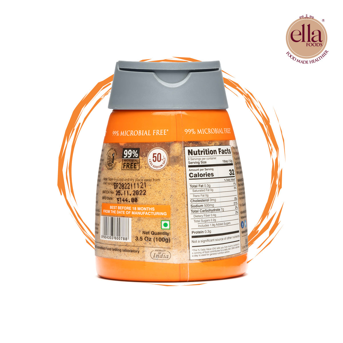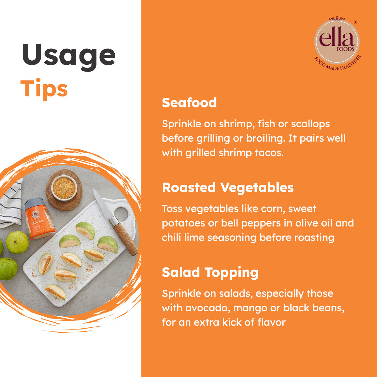 Our chilli lime seasoning is made with flavourful powdered chillies and pulpy organic lime. A perfect blend of salty, spicy, tangy, and citrusy taste notes. It is made with salt that has 50% less sodium and makes for a healthy and delicious choice. It is great for enhancing your metabolism and improving digestion.