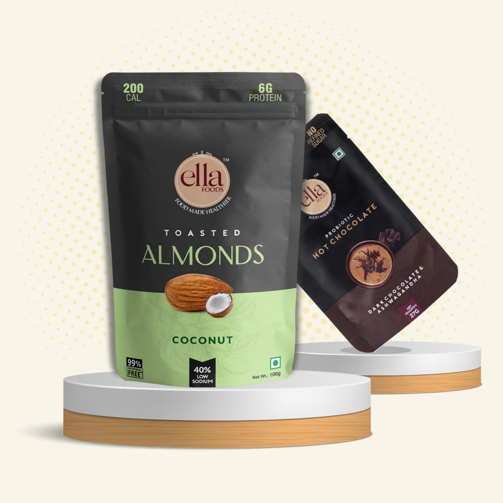 Ella Foods Cozy Indulgence Combo | Coconut Toasted Almonds 100g & Hot Chocolate 27g x 2 | Healthy Snack & Beverage Gift Pack